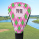 This custom ladies personalized golf driver head cover features bright pink and green argyle with a customizable monogram on a pink background. It's a stylish, cute gift for a golfer. It's a useful present for your mom, sister, grandma, or any lady whose hobby is playing golf.