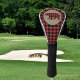 L'arrière - plan sur cette couverture de tête de golf unique est un motif de plaid de buffle rouge et noir. Au centre se trouve une bannière en cercle bronzé avec un ours en silhouette rouge et noir assorti. Parfait pour le golfeur qui est aussi un chasseur, ou qui aime juste la faune.
