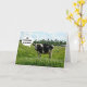 Black and white cow standing in the pasture, with a little humorous saying: "I'm outstanding in my field!"
