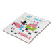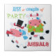 Here's a fun and colourful kitchen tile that features two cartoon "party animal" cows. One is dressed in a lime green and orange flower tropical shirt. The other wears a black top hat and blows a noisemaker. The stylized text says "Just a couple of PARTY ANIMALS". Colours used include pink, blue, lime green, black, white and orange. Cute! *Clip art used in this design is copyrighted by Encore Software, Inc., which permits use to its licensors. All rights reserved.