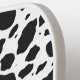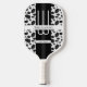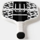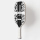 A monogram pickleball paddle in black, white, and grey with a cow print background.