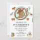 A "saddle up" cute and whimsical wild west cowboy first birthday invitation in terracotta browns and blues for a boy, with western gear cowboy gear and ranch animals. Saddle, steer, horses, cactus, saddle and lasso. Everything as cowboy needs. It's his first rodeo! The back of the invite has a dark brown barn wood effect.