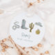 Cute and rustic cowboy theme baby shower favour tag featuring illustration of a cowboy boot, hat, snake, and cacti.