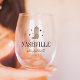 Welcome friends to your bachelorette weekend with these cute personalized stemless wine glasses. Design features a tan cowboy boot illustration with your destination beneath (shown with Nashville) in classic serif lettering. Add your name(s) or occasion name beneath in handwritten cursive script, as well as the year.