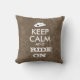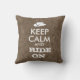 This customizable cowboy pillow says Keep Calm and Ride On. It has an image of a cowboy hat instead of the crown logo.