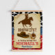 Howdy! Welcome everyone to have fun at your rodeo birthday party with a cowboy rodeo sign template. This rodeo cowboy birthday welcome sign features cow print, red bandana design and jeans colours with rodeo cowboy complete with a hat and lasso on a modern style sign design.
