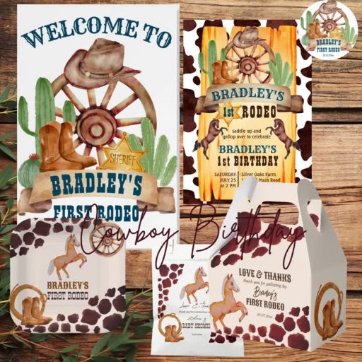 Cowboy first rodeo horses, equestrian, wild west and farm themed birthday bunting flags party banner, with a running horse, wheel, cowboy shoes and hat on a denim photo background.
