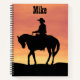 A cowboy rides his horse, silhouetted against a bright sunset sky, on this beautiful spiral notebook for a western horse enthusiast.