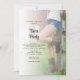 Invite guests to a down home gathering with the charming Cowgirl Barn Party Invitation. The casual yet classy custom rustic ranch theme party invite features a farm photograph of a teen girl wearing blue jean shorts and brown leather western cowboy boots leaning on a weathered wooden fence with a red barn in the background.