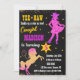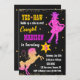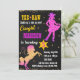 This purple and yellow cowgirl theme invitation features glitter cowgirl's silhouette, glitter horse's silhouette and big yellow badge with an age.