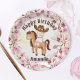 Cute little cowgirl saddle up birthday personalized party plates. Cowgirl riding cute baby horse and pink flowers. Brown and pink yellow farm colours.