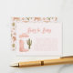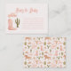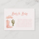 Cute cowgirl theme baby shower book request card featuring illustration of cowboy boot, hat, and a cacti. The card asks guests to bring in a new or used children's book instead of a card.