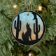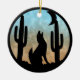 A lovely Southwestern style image featuring a coyote in the desert, surrounded by cacti, howling at the moon in the evening sky.