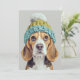 This adorable beagle is all set for the winter with its cute knitted hat featuring shades of green and blue, topped with a fluffy pom-pom. The dog’s expressive eyes and floppy ears make it look even more endearing and ready for the cold season.