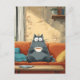 A cute, fluffy grey cat sits wide-eyed on a bright orange couch, clutching a warm cup of coffee. Soft sunlight fills the cozy living room, complete with pillows, books, and rustic charm. Perfect for cat lovers and coffee enthusiasts alike, this whimsical illustration brings warmth, humour, and relaxation to any space. Ideal for mugs, prints, and home decor.