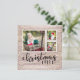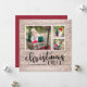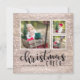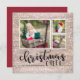 Festive and whimsical holiday photo cards in a unique square shape feature three of your favourite photos in a collage layout, on a rustic faux wood plank background dotted with a border of white stars and snowflakes. "Christmas Cheer" appears in black hand lettered typography with your family name or names beneath. Cards reverse to solid red.