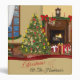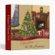 Cozy winter fireplace in a room decked with Christmas tree and presents. This photo album binder is ready to be personalized with your family name.