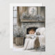 This Christmas holiday card features a rustic stone fireplace glowing in a softly lit room styled with a wicker chair, white throw blanket, and snowy pine garlands on the mantlepiece. A wintry tree print and soft neutral palette add to the calm, cozy feel. The verse Wishing you peace, joy, and happiness this holiday season appears on the back, with space to personalize your name or signature. (You may also write your own greeting or verse instead).