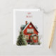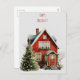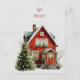 A charming red house stands under falling snow, decorated with lights and garlands. A vibrant Christmas tree adds to the festive atmosphere in this picturesque winter scene. The inscription can be changed