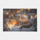 Experience the magic of winter with this serene image of a red fox peacefully sleeping in the snow, surrounded by glowing fairy lights and a rustic lantern under snow-dusted pine branches.