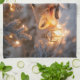 Experience the magic of winter with this serene image of a red fox peacefully sleeping in the snow, surrounded by glowing fairy lights and a rustic lantern under snow-dusted pine branches.