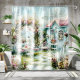 This shower curtain design showcases a romantic vintage garden scene that radiates charm and tranquility. A teal cottage with a pink roof sits behind a white picket fence, surrounded by lush greenery and blooming pink and white flowers. A wrought iron table and chairs with pink cushions rest beneath a floral archway, set for tea with a delicate dessert display. Butterflies flutter through the air, and climbing vines frame the cozy setting, while a stone path leads to the cottage door flanked by flower-filled planters. Ideal for cottagecore or shabby chic decor, this illustration brings a peaceful, storybook atmosphere to any bathroom.