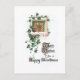 Charming antique Christmas card illustration featuring cozy glowing window with robin sitting on the snow-covered ledge with ivy growing around it. Back features complementary graphics and editable text fields.