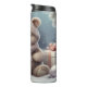 The bear is dressed in warm winter knits, specifically a chunky, light pink/beige knitted beanie and a matching cozy scarf. The background is a soft, blurred winter landscape, framed by snowy pine branches and falling snow. In the foreground, there are decorative Christmas ornaments in soft pastel shades (pink, blue, silver) and a wrapped gift box with a pink ribbon, emphasizing the festive, gifting spirit. The overall mood is sweet, serene, and perfectly cozy for holiday merchandise like tumblers and mugs