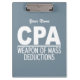 “Weapon of mass deductions”. Change the text field to what you want. You can also change the font and its size and colour by using the "Customize it" function, as well as add more text fields if you wish. You can also change (edit) the background colour of this item to any colour of your choice. See my store for more items with this design.
