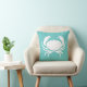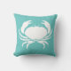part of the ocean themed decor CRAB WHITE on teal blue pillow on one side and teal and white stripes on back. Design by Sandy Closs