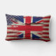 Cool lumbar pillow with a British American fusion design featuring a print of the American flag and the Union Flag merged together on rustic wood with paint peeling off.