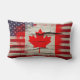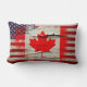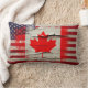 Cool lumbar pillow for a Canadian American featuring a print of the American flag fused with the Canadian flag on rustic wood with paint peeling off.