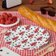 Sewn effect Christmas trees with printed button decoration on Christmas party products and favours.