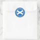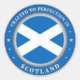 The national flag of Scotland, St. Andrew`s Cross or Saltire, is infused into a ring that is not unlike a cog or gear. The coloring of the ring is in the blue color of the flag, and the text and decorative stars that are around the ring, are done in faux silver. The text and decorative stars have been given a raised look, which helps with their definition.