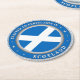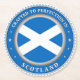 The national flag of Scotland, St. Andrew`s Cross or Saltire, is infused into a ring that is not unlike a cog or gear. The coloring of the ring is in the blue color of the flag, and the text and decorative stars that are around the ring, are done in faux silver. The text and decorative stars have been given a raised look, which helps with their definition.