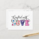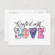 This postcard features elegant script for the 'Crafted with' portion of text, while 'LOVE' has been crafted with my love :) in photoshop using colourful patterns, buttons, bows and stitching effects. Choose any lighter background colour to suit. Search ID193 to see other products with this design.