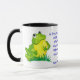 Une tasse blanche avec une jante et une poignée noires et une grenouille verte avant et arrière, d'une illustration de l'aquarelle de Judy Adamson. Entre les deux grenouilles se trouve le premier verset de la rime de la pépinière, 'Une grenouille qu'il allait a-boiser..' en lettres bleues.