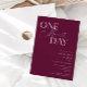 Minimalist wedding rehearsal dinner invitation featuring typography text that says "one more day." The background is cranberry.