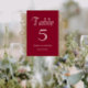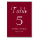 Guide your wedding reception guests to their table with this simple style table number card that features white, stylized lettering on a trendy, cranberry red colour background. Design is on each side of card. Edit your card to change table number, wedding couple's names and date. Order cards separately for each table number.