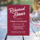 Simple style wedding rehearsal dinner invitations that feature white, stylized lettering on a trendy, cranberry red colour background. Edit your invitations by replacing names, date/time, location, and contact info with your own. Select your invitation size and paper style.