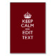 Your personalized Keep Calm saying on a fine custom burgundy accent colour style decor. A personalized Keep Calm style saying on a one of a kind gift. Humourous or whimsical try on your creative words on two editable lines of text. Remember to use CAPITAL letters for best results.