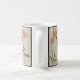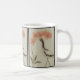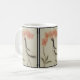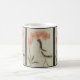 A whooping crane extends its neck upward to reach an oversized orchid in the Asian-inspired design on this mug. The crane is marked with black on its neck and wings and with red on its face and head. The phalaenopsis orchid is pale orange with deep green leaves at the base of its arcing stem. The deep beige background and distressed appearance give the image the look of an antique painting on paper that has faded over the course of time. From my original digitally created image.
