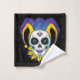 Préparez-vous à votre fête Mardi Gras avec ce crâne coloré Lady Jester avec fleur de lis, bijoux et coeur.