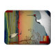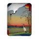 A pair of cranes together beside pond and cherry tree. Colourful vintage artwork from a woodblock print.