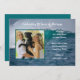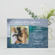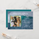 Anniversary party invitation with photo of the couple. Crashing ocean waves design with white, Old English style font - change it in the customize area. A bold line of text at the top for years of marriage. All party information is added using a paragraph template. Upload a photo, either horizontal or vertical, with subject in the centre. The square photo template is outlined in white. Reverse is solid blue-green colour.