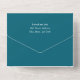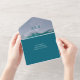 Crashing waves invitation for couples getting married on the coast. The all-in-one folded invitation has a detachable reply card at the bottom. A big, blue-green sea wave is the background for white text. The couple’s initials create a monogram at the top, under the flap. Invitation text is printed beneath names, which are in bolder font. Calligraphy lettering is used with simple attendance wording on the RSVP. The outside of the card is deep sea blue-green colour with three places to include addresses.