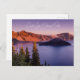 A pink winter sunrise highlights the cliffs surrounding Crater Lake in Oregon.