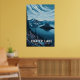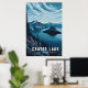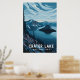 A stunning illustration depicting Crater Lake National Park. A vast, deep blue lake rests within a volcanic caldera, surrounded by snow-capped mountains. Wispy clouds float above the breathtaking vista, adding a touch of serenity.