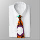 Cette cravate a un design géométrique de cercles de différentes couleurs avec des lignes qui sortent.