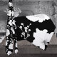 Un cravate mariage noir et blanc avec un arrière - plan noir solide avec des fleurs blanches de pivoines et des sprigs de verdure.